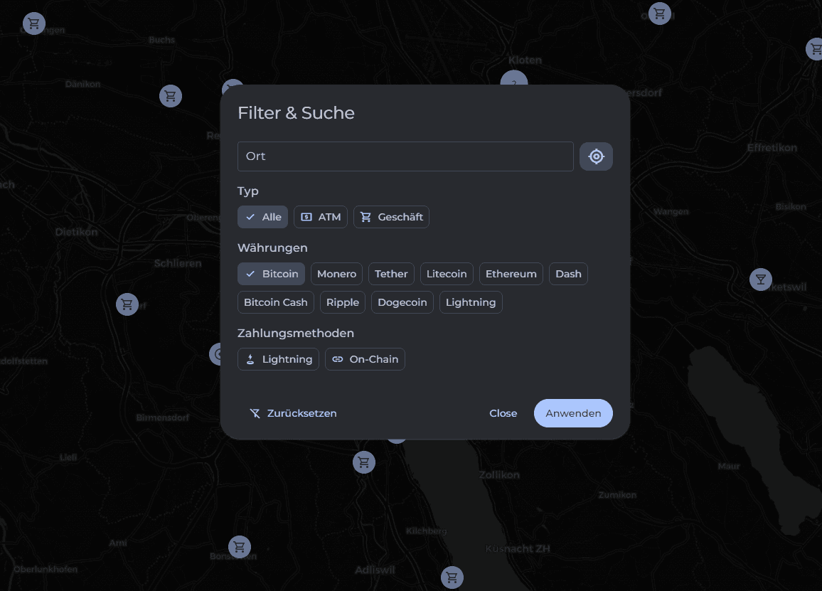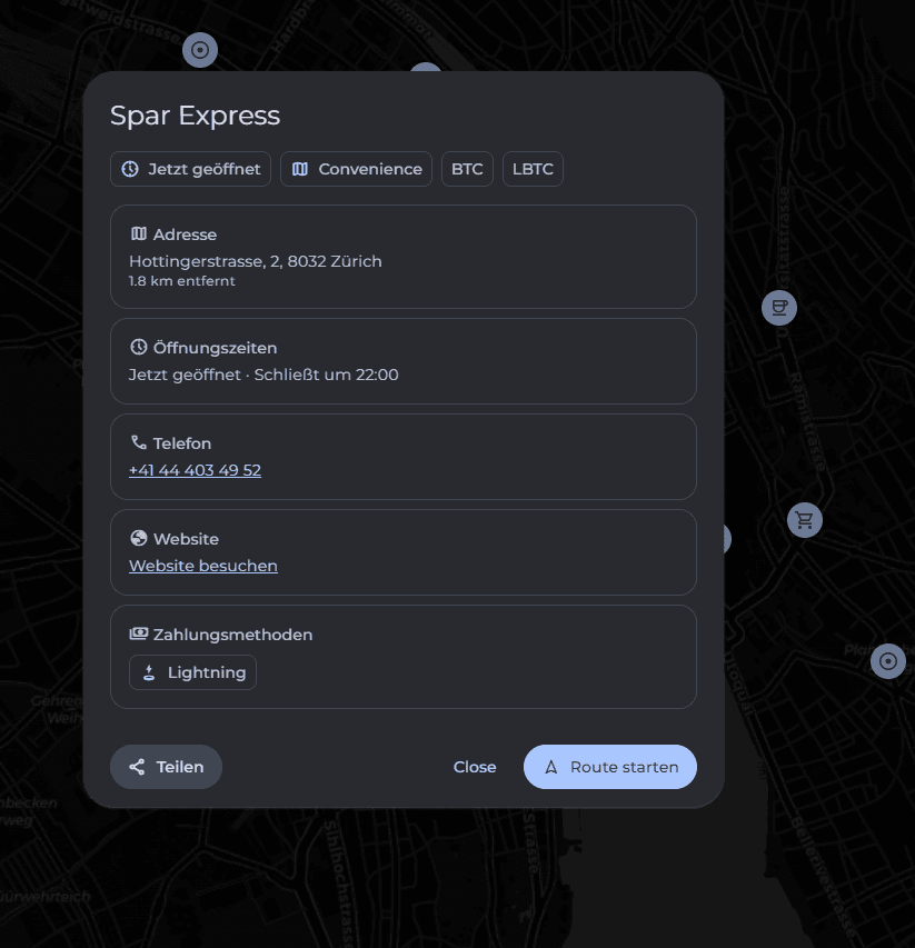 ETERNX Places is the interactive map for crypto acceptance points in everyday life. Discover restaurants, bars, shops, and crypto ATMs where cryptocurrencies can be used – including opening hours, navigation, and direct contact options.