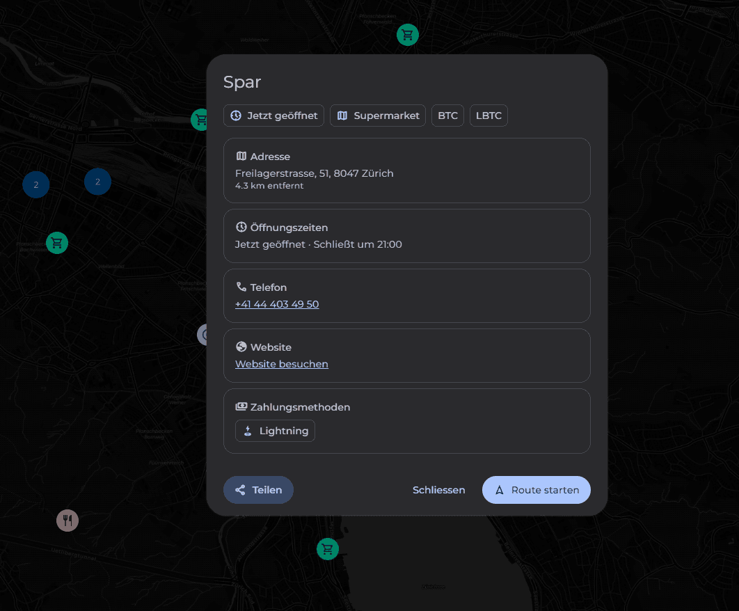 ETERNX Places is the interactive map for crypto acceptance points in everyday life. Discover restaurants, bars, shops, and crypto ATMs where cryptocurrencies can be used – including opening hours, navigation, and direct contact options.